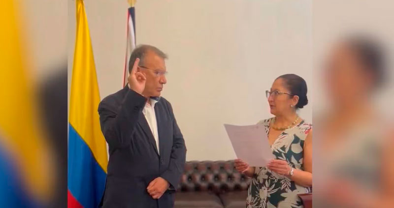 “Jura usted ante dios y promete solemnemente cumplir bien y fielmente con la Constitución, las leyes y los deberes que el cargo de embajador extraordinario, plenipotenciario, código 03 grado 25, en la embajada de Colombia ante el Reino Unido de Gran Bretaña e Irlanda del Norte le impone (…) Si así lo hiciere, dios y la patria lo premien, si no el y ella lo demanden”, indicó la encargada del acto oficial de la diplomacia nacional.