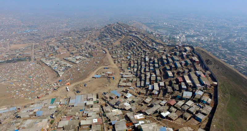 La cerca, compuesta de piedras con alambres y púas, separa la Municipalidad de La Molina, caracterizada por sus propiedades lujosas, del distrito colindante Villa María del Triunfo (VMT), donde los habitantes viven en condiciones precarias.