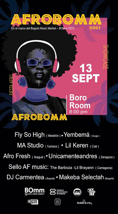 AFROBOMM organizado por la Fundación Huellas y Memoria se desarrolla en el marco del Bogotá Music Market 2023 creado para promover los negocios y abrir espacios para que los diferentes agentes de la industria musical en Colombia encuentren oportunidades de circulación y comercialización.