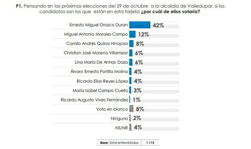 Este lunes 2 de octubre, la Gran Encuesta por la Alcaldía de Valledupar fue revelada por el Centro Nacional de Consultoría (CNC) y publicada por Radio Guatapurí, dejando en evidencia que la intención de voto de los vallenatos está inclinada a que Ernesto Orozco sea el próximo alcalde de la ciudad de Valledupar.