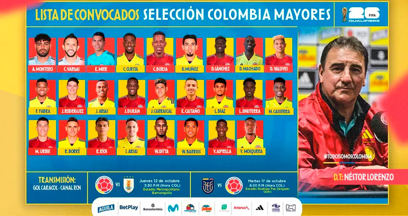 El 12 y 17 de octubre la selección Colombia volverá a tener acción en las Eliminatorias Sudamericanas Conmebol. El primer obstáculo en la fecha doble de las clasificatorias a la Copa Mundial de la FIFA Estados, Unidos, México y Canadá 2026, será ante Uruguay, dirigida por Marcelo Bielsa, en el estadio Metropolitano de Barranquilla.