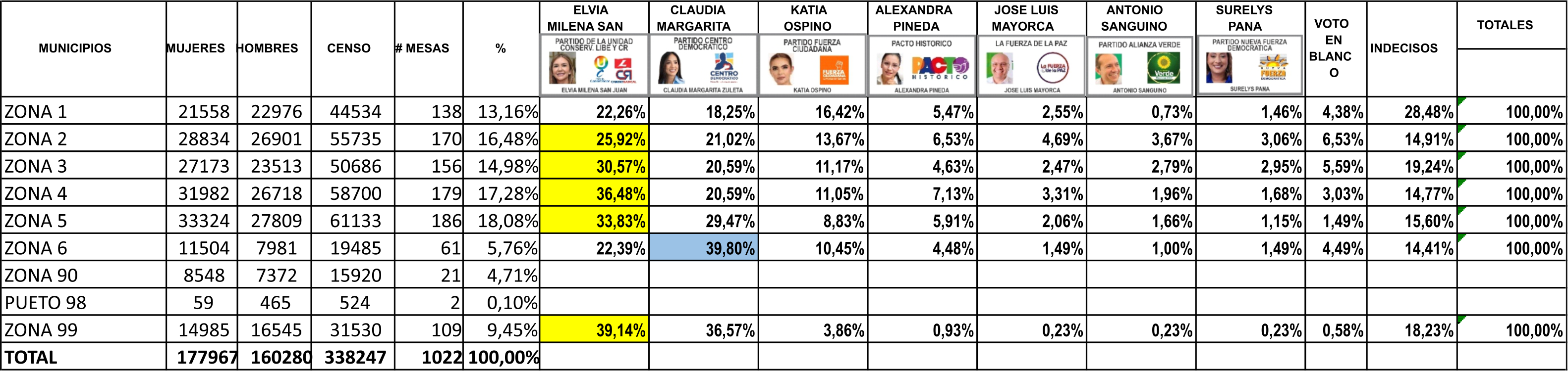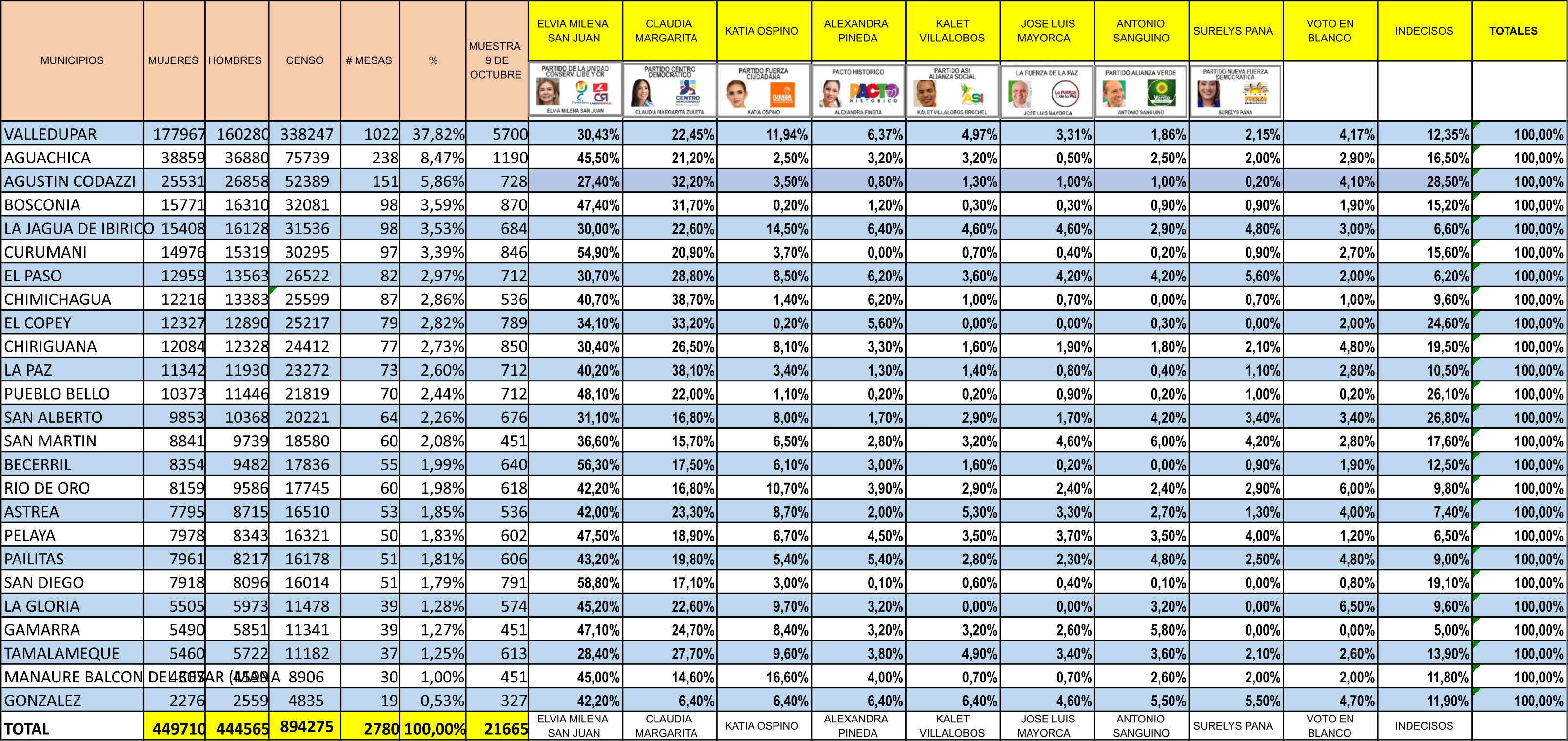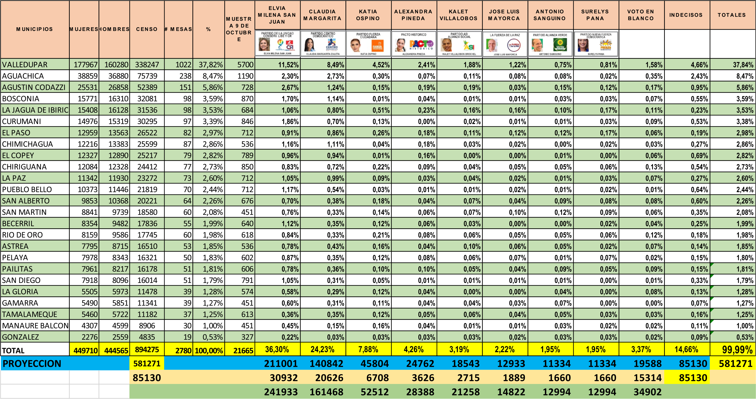 En este gráfico se encuentran los 25 municipios, la cantidad de hombres y mujeres que conforman el Censo para las elecciones de octubre 2023, el número de mesas, el porcentaje que representa cada municipio, el tamaño de la muestra y los resultados de cada candidato en cada uno de los 25 municipios del Cesar.