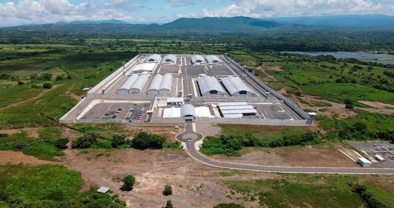 El Cecot se encuentra en la central localidad de Tecoluca, a más de 75 kilómetros de la capital San Salvador, y es un laberinto de concreto, hierro, asfalto y acero que custodian guardias penitenciarios y soldados desde torres con más de 15 metros de altura.