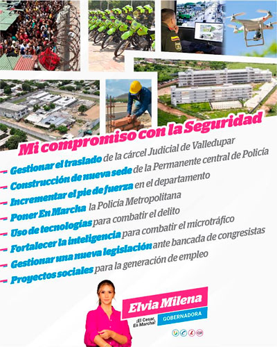 La candidata a la gobernación del Cesar, Elvia Milena Sanjuán, está comprometida en seguir combatiendo el delito y devolverle la tranquilidad a los cesarenses. Este objetivo forma parte de su plan de gobierno El Cesar en Marcha.