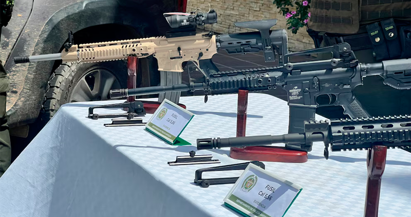 Entre los elementos incautados se incluyen un fusil calibre 5.56 modelo WW15 de fabricación estadounidense, dos fusiles calibre 5.56 modelo M16 A4 también de origen norteamericano, dos miras telescópicas marca Trijicon ACOG y tres cargadores para fusil calibre 5.56, al igual que el vehículo particular.