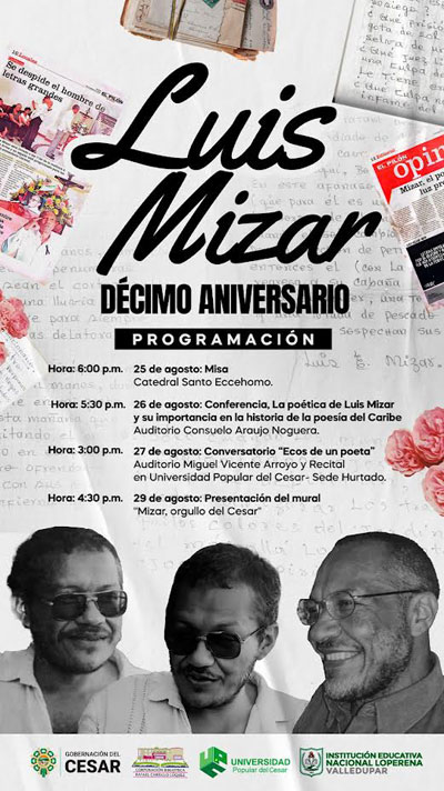 El martes 26 a las 4:30 p.m. será presentada la ponencia “La poética de Luis Mizar y su importancia en la historia de la Poesía del Caribe” en el auditorio Consuelo Araújo Noguera, el miércoles 27, a las 3:00 p.m., se llevará a cabo el conversatorio “Ecos de un poeta, en memoria de Luis Mizar Maestre” en el auditorio Miguel Vicente Arroyo de la Universidad Popular del Cesar.