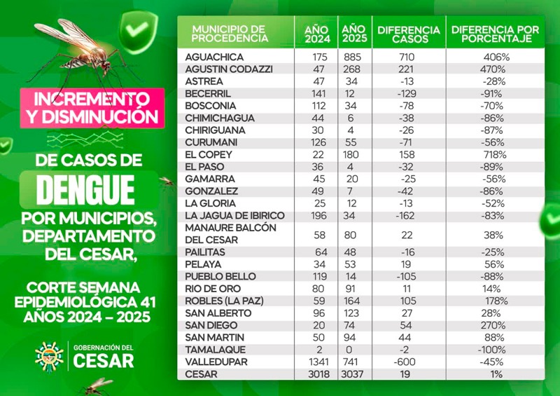 El Gobierno del Cesar, a través de la Secretaría de Salud reportó una reducción en la mortalidad por dengue. Durante lo corrido del año, se han reportado 2.972 casos de dengue, de los cuales el 43,6% corresponden a dengue sin signos de alarma, el 54,6% a dengue con signos de alarma y solo el 1,8% a dengue grave, cifras que representan una disminución del 1% en los casos de dengue en comparación con el 2024, cuando se notificaron 2.956 casos en el mismo periodo.