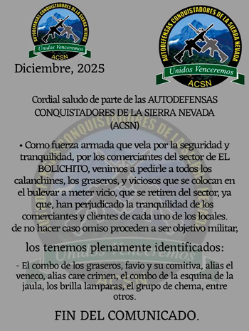El panfleto está firmado por presuntos miembros de las Autodefensas Conquistadoras de la Sierra Nevada (ACSN), y fue enviado a través de mensajes de WhatsApp a varios comerciantes de la zona.