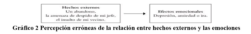 Para clarificar lo anterior, permítame utilizar esta explicación de Rafael Santandreu en el libro arriba aludido: “Las personas solemos tener la impresión de que los hechos externos —lo que nos sucede— impacta sobre nuestras vidas produciendo emociones: rabia o satisfacción, alegría o tristeza… Existiría, según esta idea, una asociación directa entre suceso y emoción. Por ejemplo, si mi esposa me abandona, me sentiré triste. Si alguien me insulta, me sentiré ofendido. Tenemos la percepción de que hay una relación lineal (de causa y efecto) entre hechos y emociones que podría seguir el siguiente esquema:” (Gráfico 2)