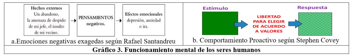 Titulé el gráfico 2 con base a la afirmación de Rafael Santandreu, quien, soportado en la psicología cognitiva (método de transformación personal que utiliza para sus terapias), expresa que la relación entre los hechos y los efectos emocionales no es directa, toda vez que se ha demostrado que existe una instancia intermedia: los pensamientos, a lo que, insisto, Stephen Covey denomina grado de libertad. Por ello, Santandreu esquematiza el funcionamiento mental, de las emociones negativas exageradas, conforme al gráfico 3a.