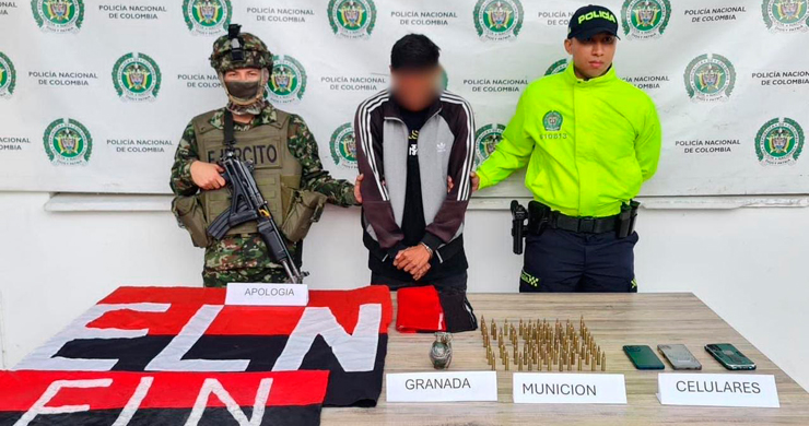 Destacaron que durante el procedimiento incautaron 85 cartuchos calibre 5.56, una granada IM26, tres banderas alusivas al ELN y 3 teléfonos móviles.