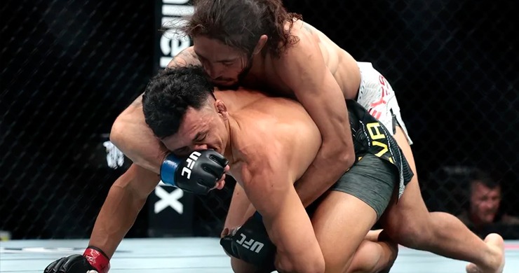 Douglas Silva escapó, pero ‘Blair’ volvió a conectarlo de forma contundente con la derecha; lo derribó y le aplicó una montada por la espalda seguida de una tormenta de puñetazos que Silva intentó defender con sus manos colocadas a los costados del rostro.