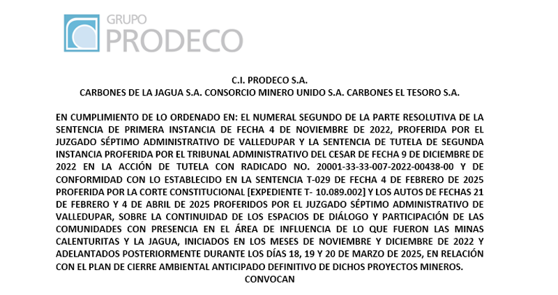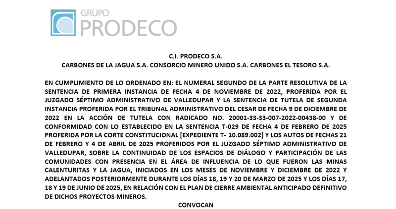 Empresa 5 de junio de 2025 Admin 2 minutos de lectura C.I. PRODECO S.A. CARBONES DE LA JAGUA S.A. CONSORCIO MINERO UNIDO S.A. CARBONES EL TESORO S.A. EN CUMPLIMIENTO DE LO ORDENADO EN: EL NUMERAL SEGUNDO DE LA PARTE RESOLUTIVA DE LA SENTENCIA DE PRIMERA INSTANCIA DE Compartir Leer más